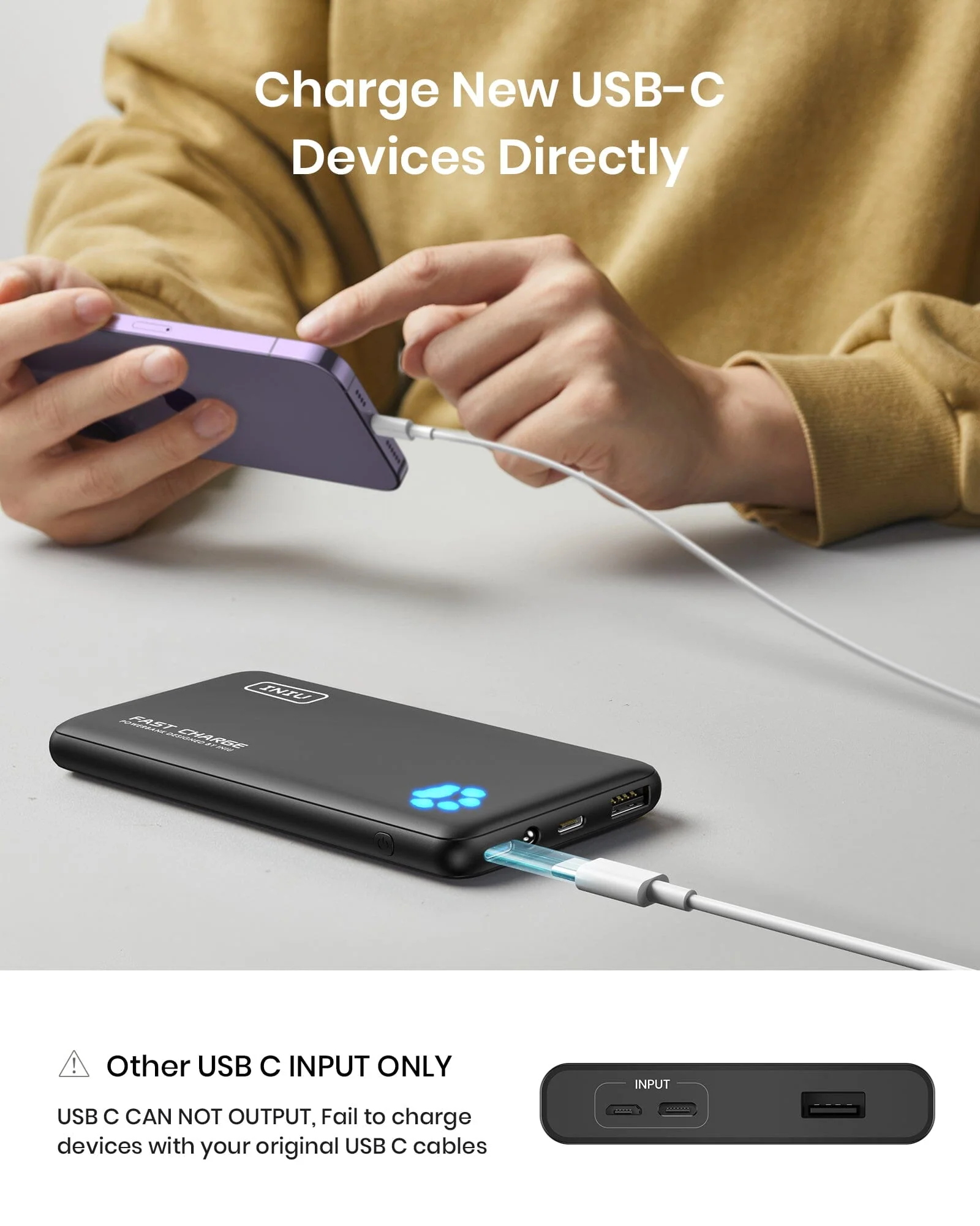 - [Charge New USB-C Devices Directly]Only got the USB-C charging cable that came with your phones? Relax, INIU can juice up your devices via 2 USB-C ports, while others ask you to hunt down old USB-A cables.