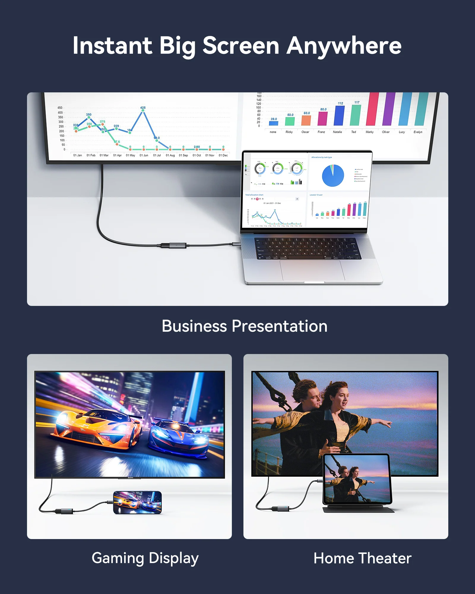 - Effortless Big Screen Experience: Transform any space into a big screen in seconds—whether for work presentations, school projects, or movie nights. Enjoy crystal-clear visuals and immersive experiences with just a plug-and-play USB-C to HDMI connection.