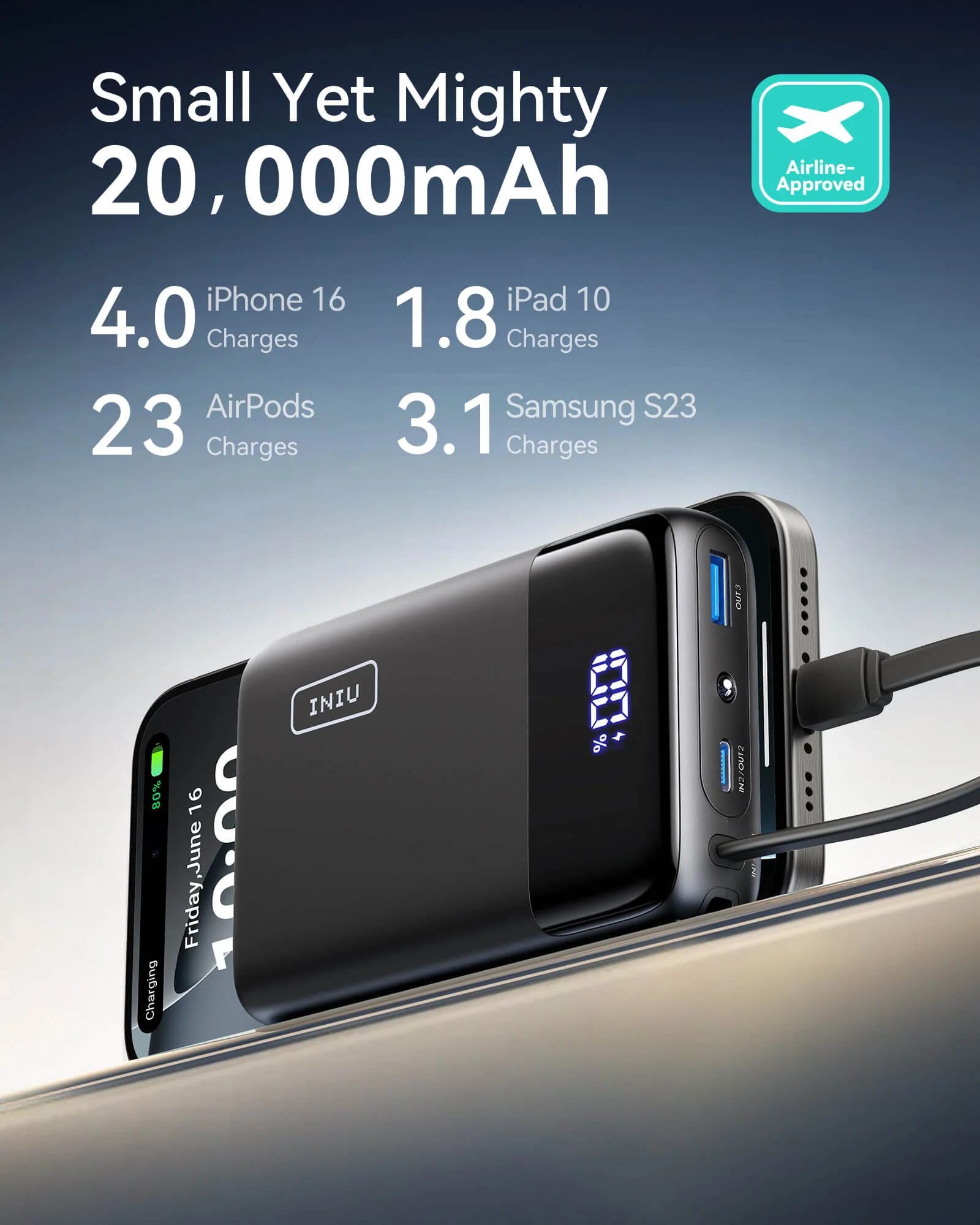 - [Recharge Once, Power for a Week] A must-have for travelers and outdoor enthusiasts, the 20,000mAh can charge your iPhone 15 up to 3.6 times. Recharge once and power through the week!